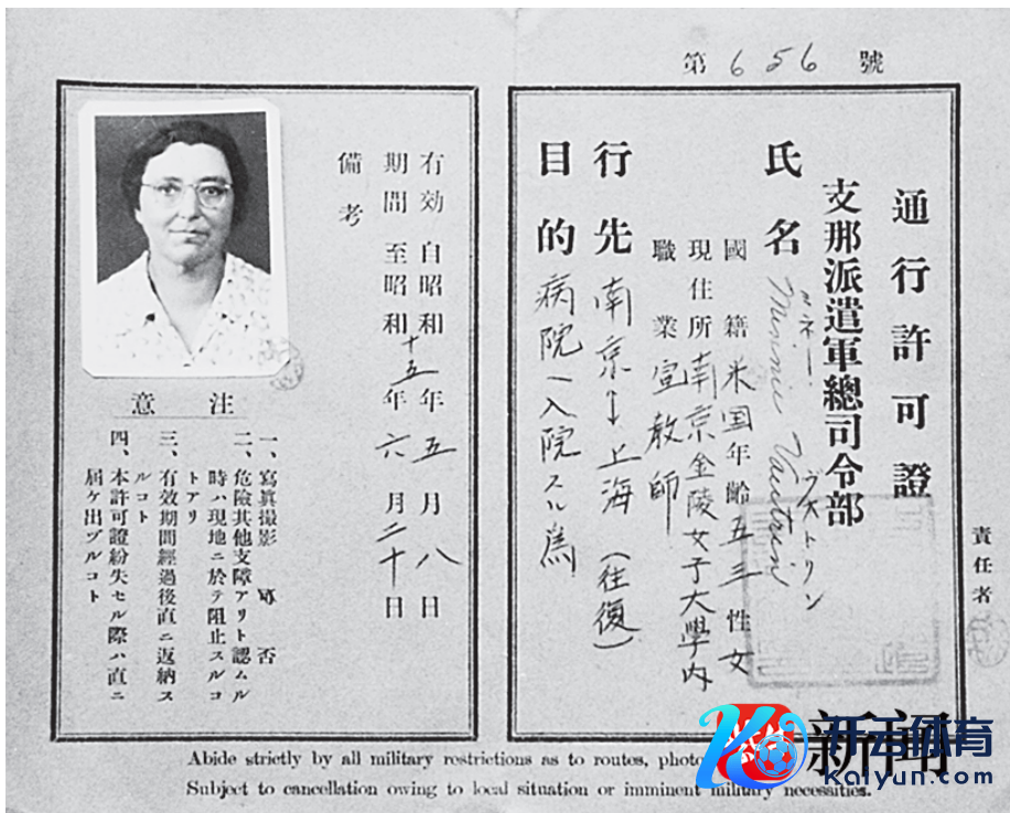 1940 年魏特琳归国看病时的通行许可证