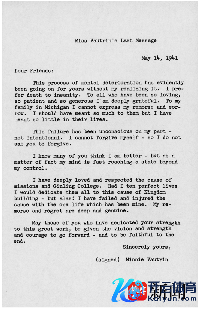 她在仓促起草的遗书中写谈:“我的精神阑珊在鸦雀无声中清澈如故捏续了多年。与其受精神狼籍词语之苦,不如一死为快……我深深地疼爱宣教业绩和金陵女大,若是我有十次生命,我怡悦一都忘我奉献给她。但很缺憾,我的此生亏负和伤害了这一业绩,对此我深表报怨和缺憾。”