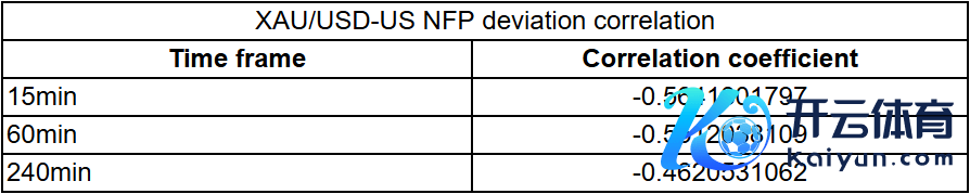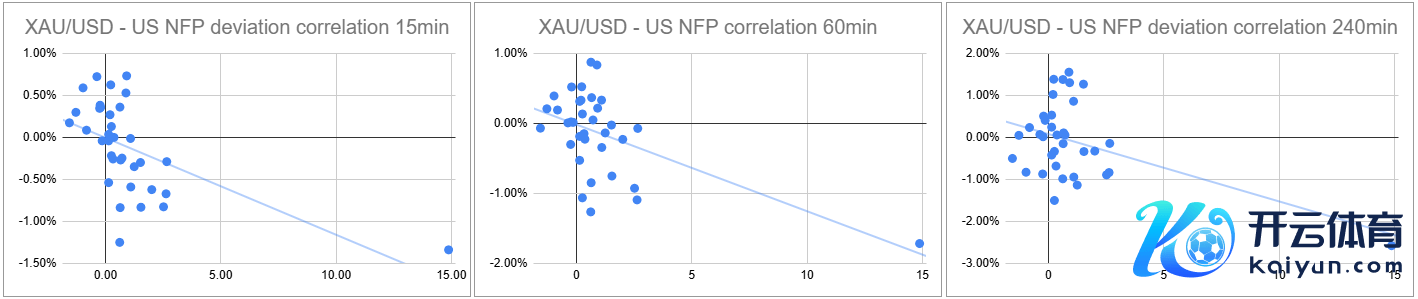 咱们绘图了非农数据发布后的15分钟、1小时和4小时内的黄金价钱反应。然后,咱们将黄金价钱的反应与骨子非农效劳与预期效劳之间的偏差进行比较。