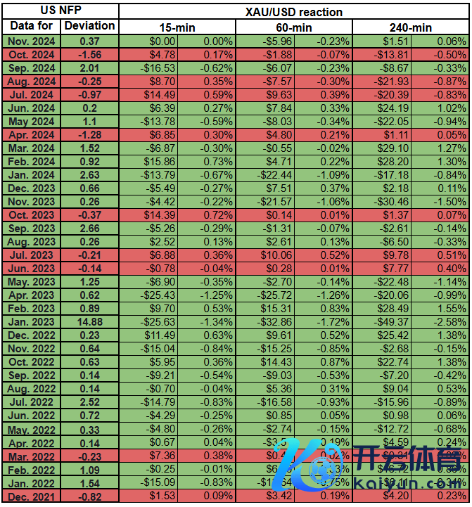 在此前35次发布的非农数据中,有9份数据不足预期,26份数据优于预期。平均而言,在令东谈主失望的数据方面,偏差为-0.64,强盛数据为1.47。数据发布15分钟后,要曲直农办事数据低于市集共鸣,金价平均上升7.13好意思元。另一方面,若数据好于预期,金价平均着落5.22好意思元。这一发现标明,投资者对弱于预期的非农数据的平直反应可能会更激烈一些。
