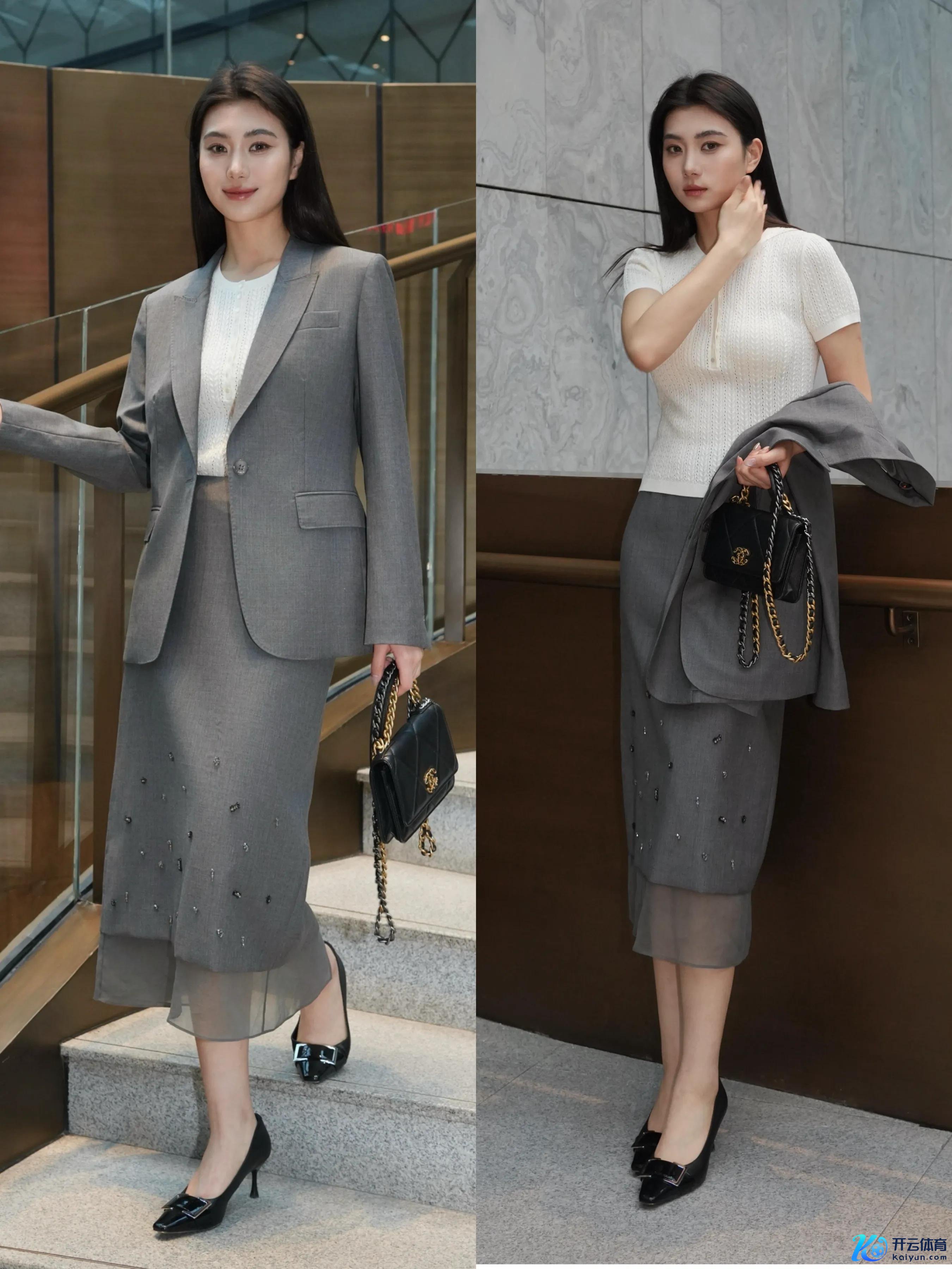比如上头这一套,灰色西服裙装内搭白色赤诚衫,脚踩玄色浅口单鞋,这样的打扮有计算,通勤好意思丽。而况,灰色的西服裙装还能弱化负责感,看起来更显高档,不刻板。