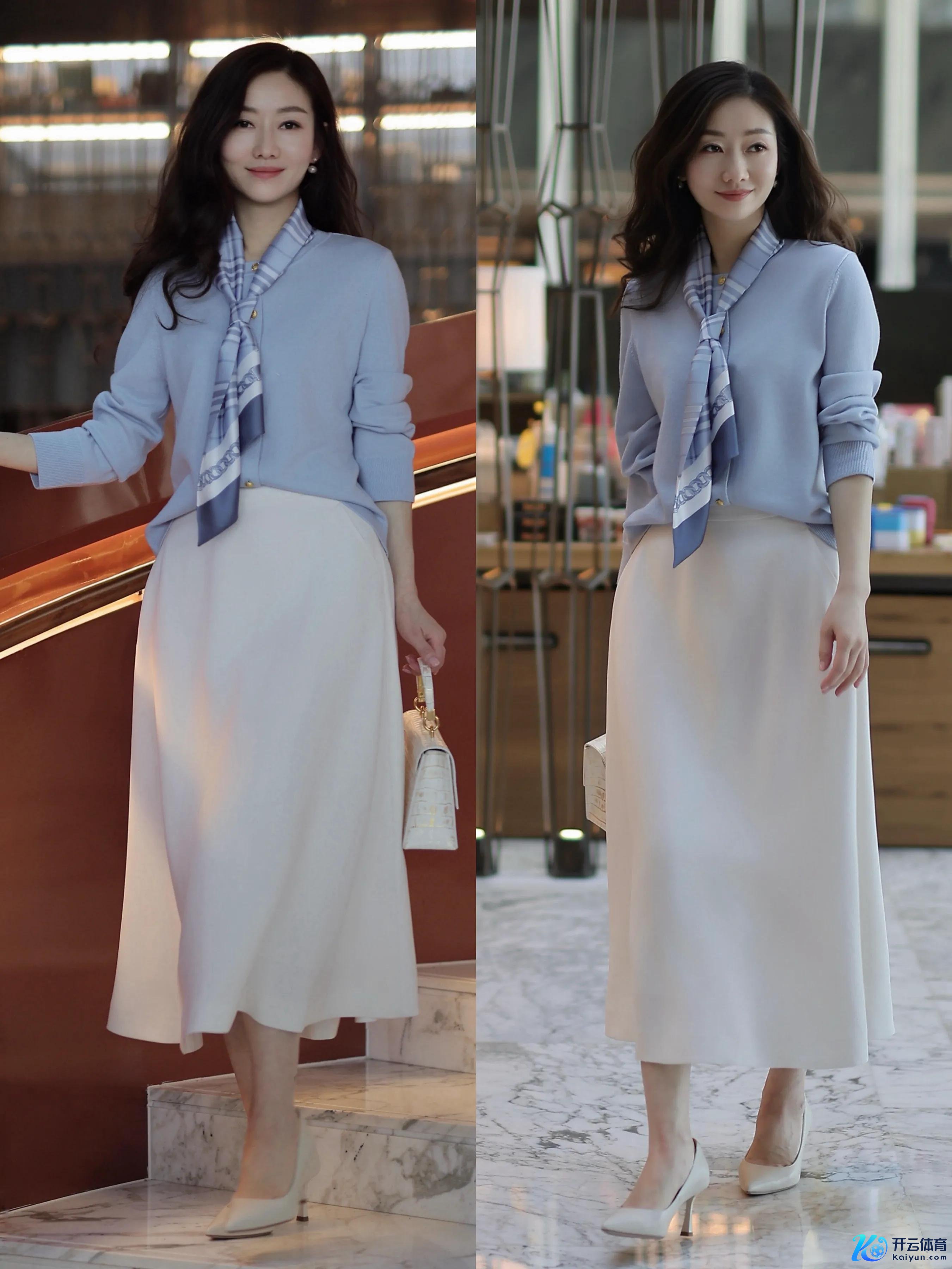 一对白色的浅口高跟鞋和白色的半裙组合,顺色搭配更显致密,再用雾霾蓝的赤诚衫来组合,让东谈主看起来新鲜又减龄,甜而不腻,关切大方。
