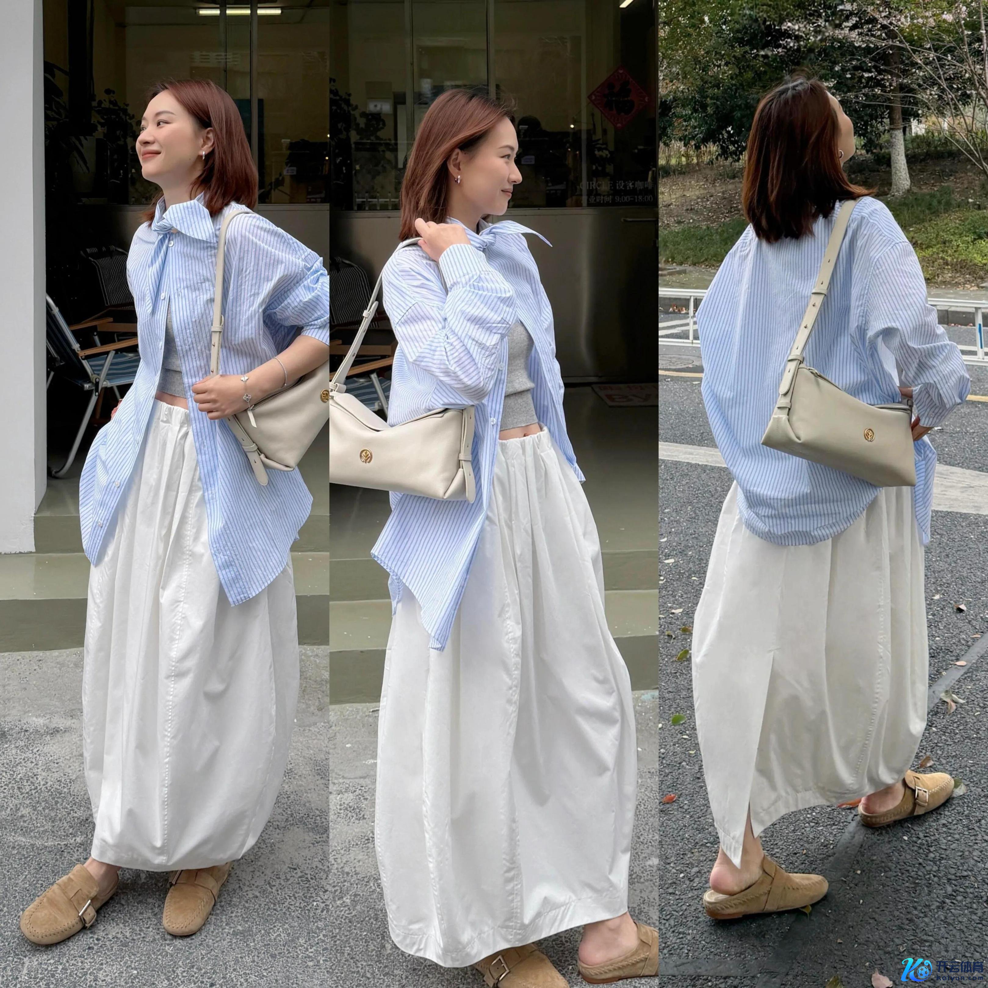 在这春日里,勃肯鞋也很受迎接,举例上头就用了地面色系的裸感鞋,配上白色伞裙,内搭短款的灰色赤诚打底衫,外披蓝色条纹衬衫就能呈现你的好躯壳,关切又不失利落感,搭简简便单的穿搭有计算,不张扬而况显得很有高档前锋感。