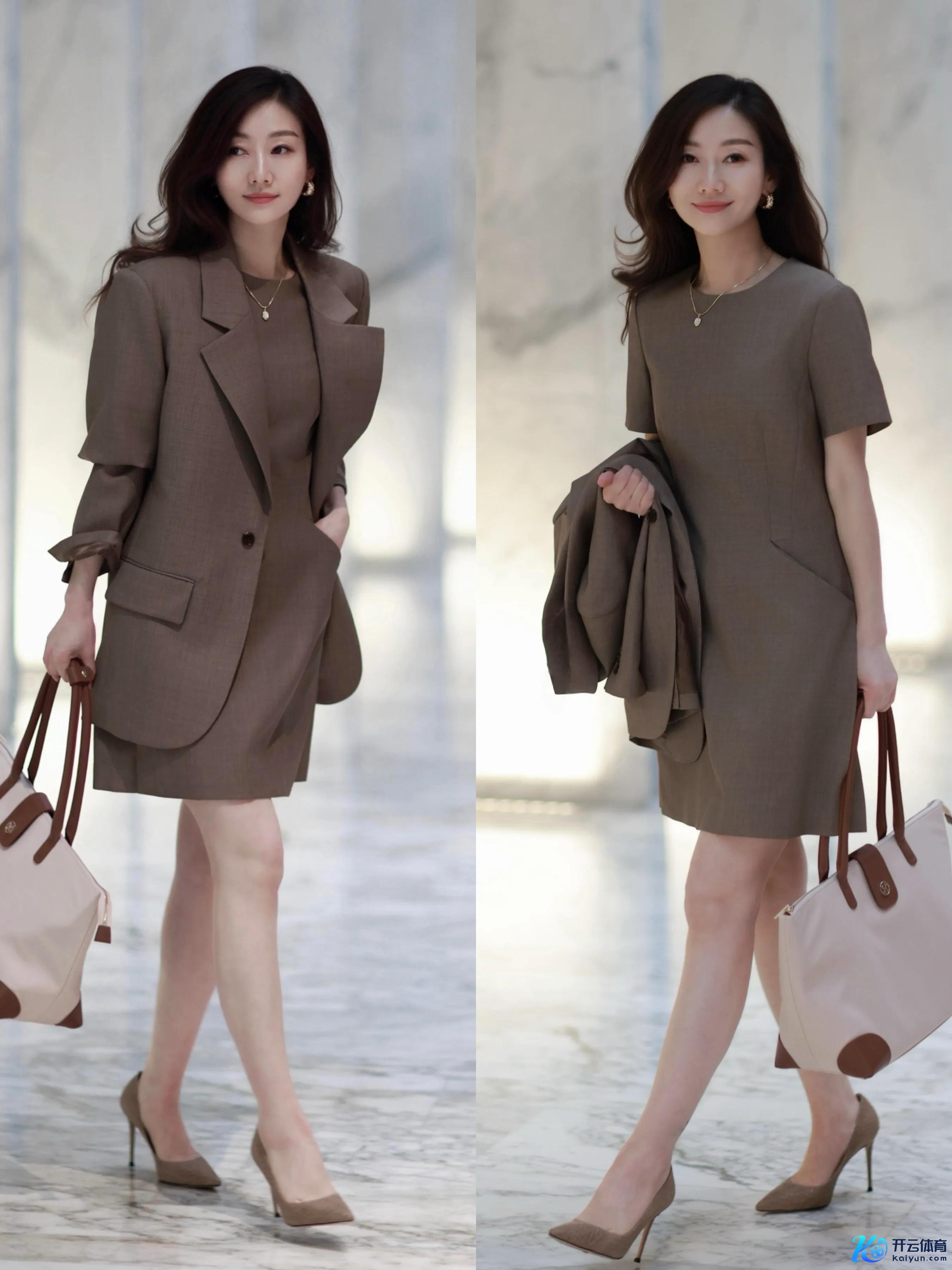 第一章节,若何把连衣裙穿出高档感?Tips ①:燕麦棕色西服裙装