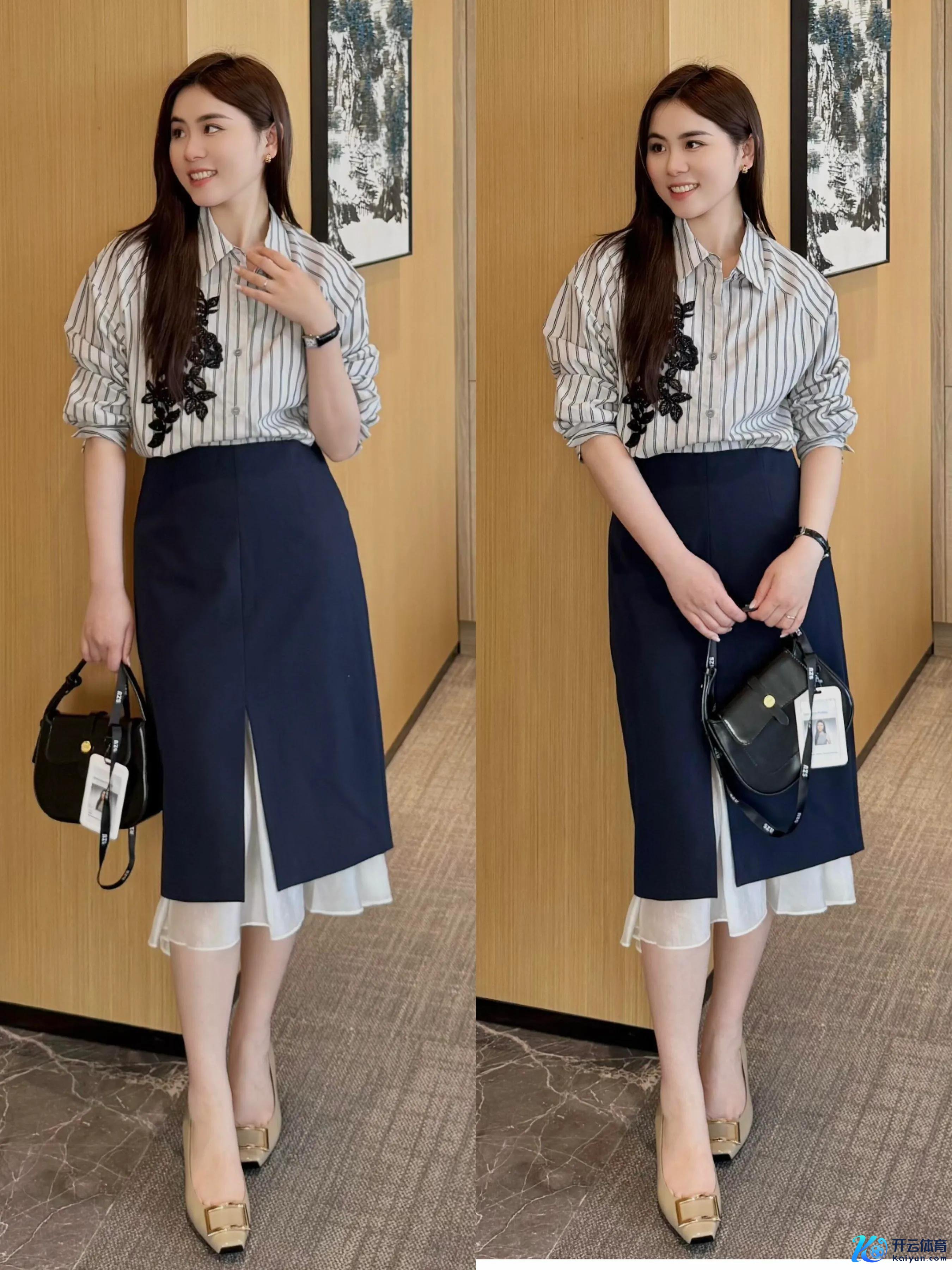 包括下半身的这条直筒半裙,白色的里衬稍长极少,这样更有线索感。