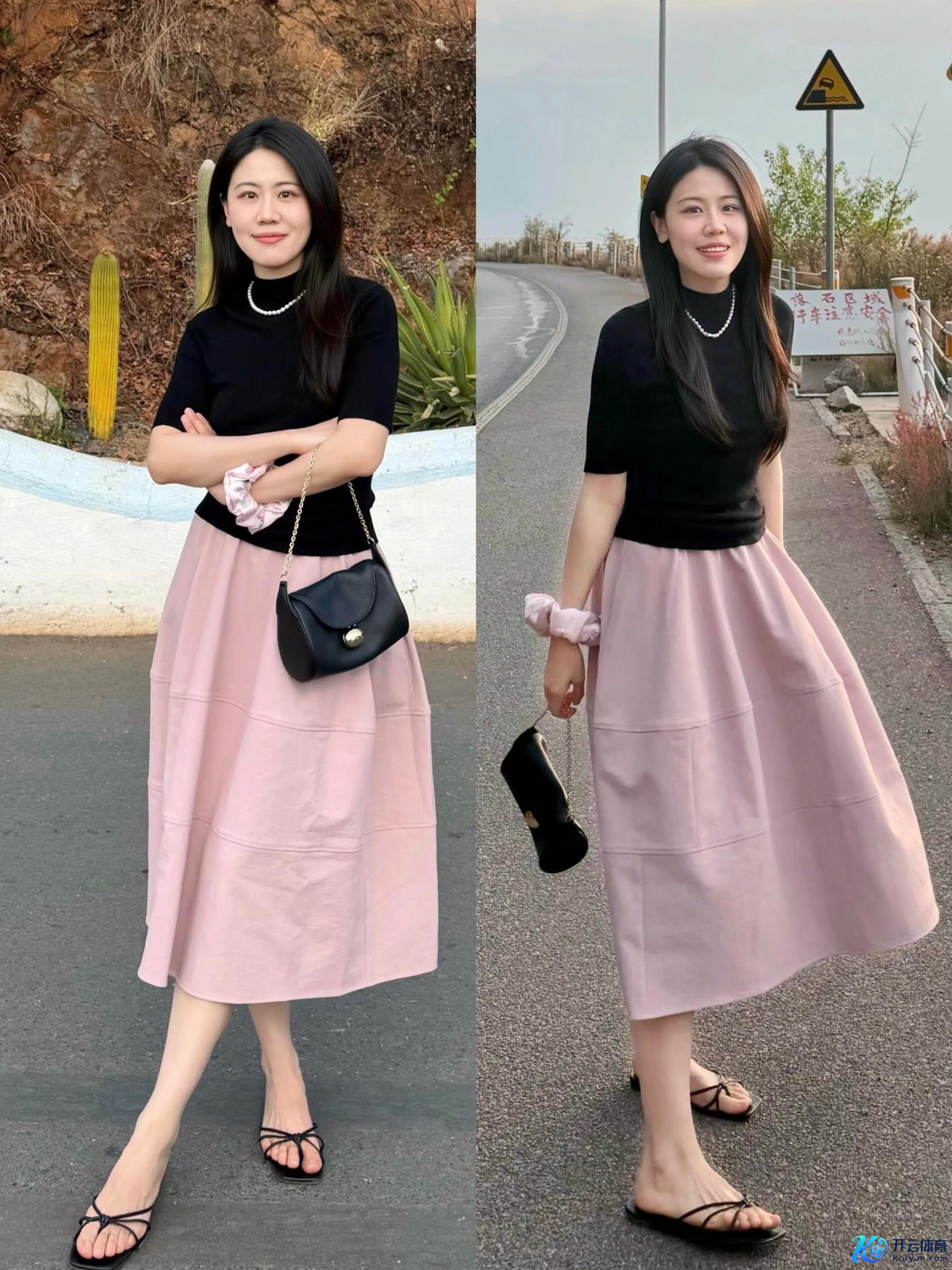 就算我们是奔 3 的女性,思要让我方自带仙女感,也不要刻意装嫩,不妨遴选相比有质感的玄色赤诚短袖,配上粉色的高腰伞裙,脚踩一对玄色凉拖鞋,这样的穿搭显年青又有余耐看,从简好意思丽,平静开脱凡俗的造型。