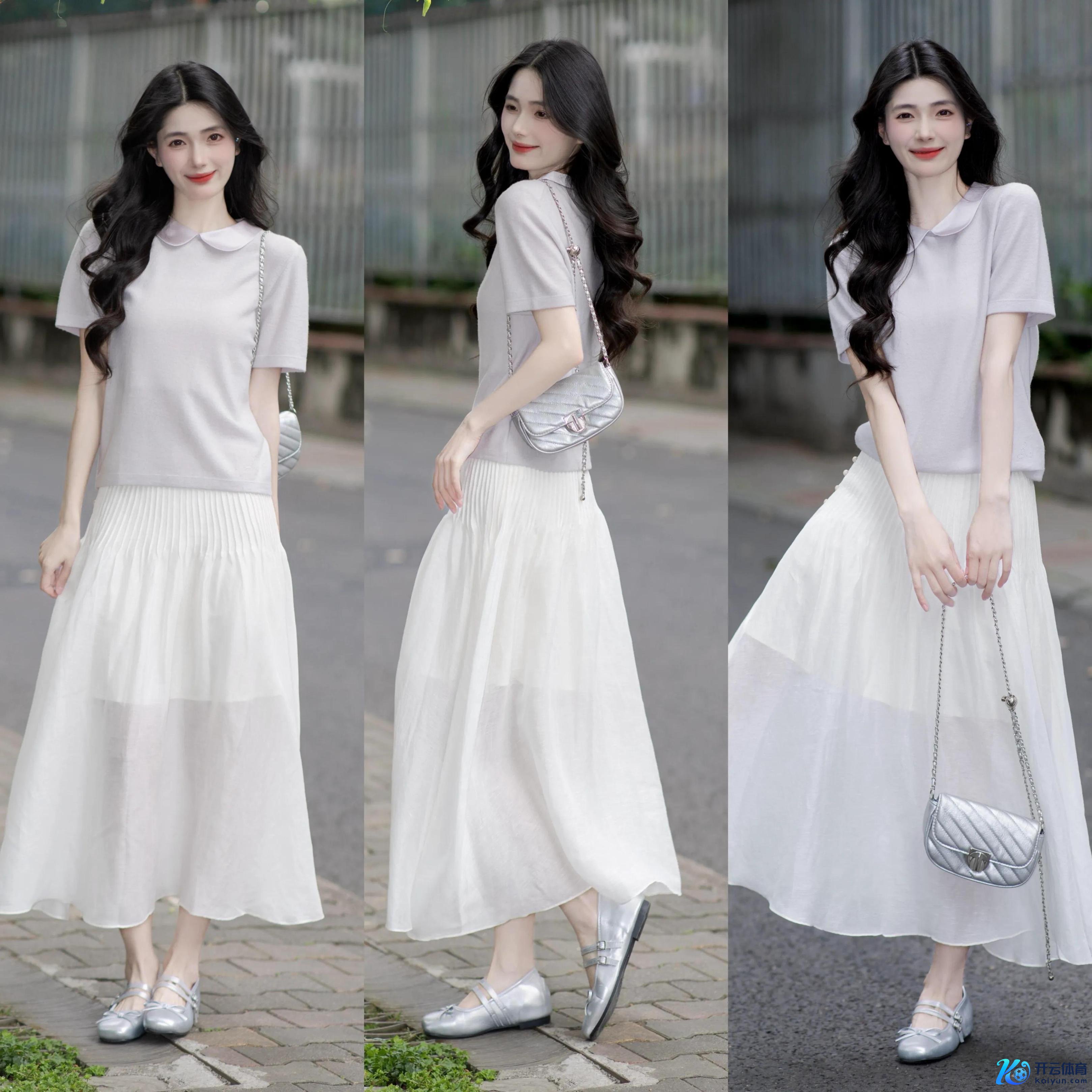 第二章节,若何穿半裙,让我方自带春日氛围感?Tips ①:浅紫色短袖+白色薄纱伞裙