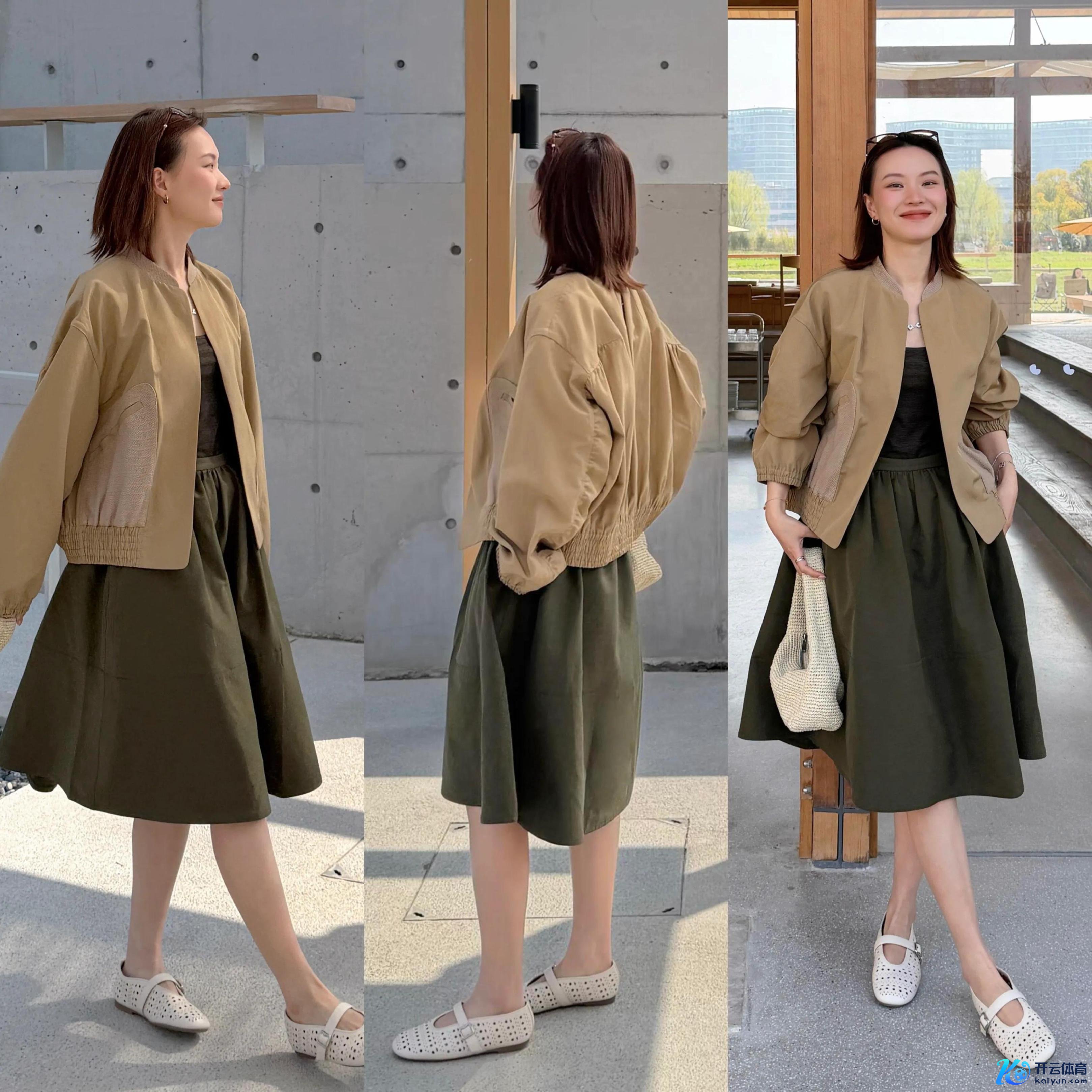 不妨我们不错从上衣高下功夫,举例用一件好意思拉德色系的夹克外衣,配上军绿色的高腰伞裙,脚踩镂空瞎想的浅口平底单鞋,这样的穿搭又帅又好意思。