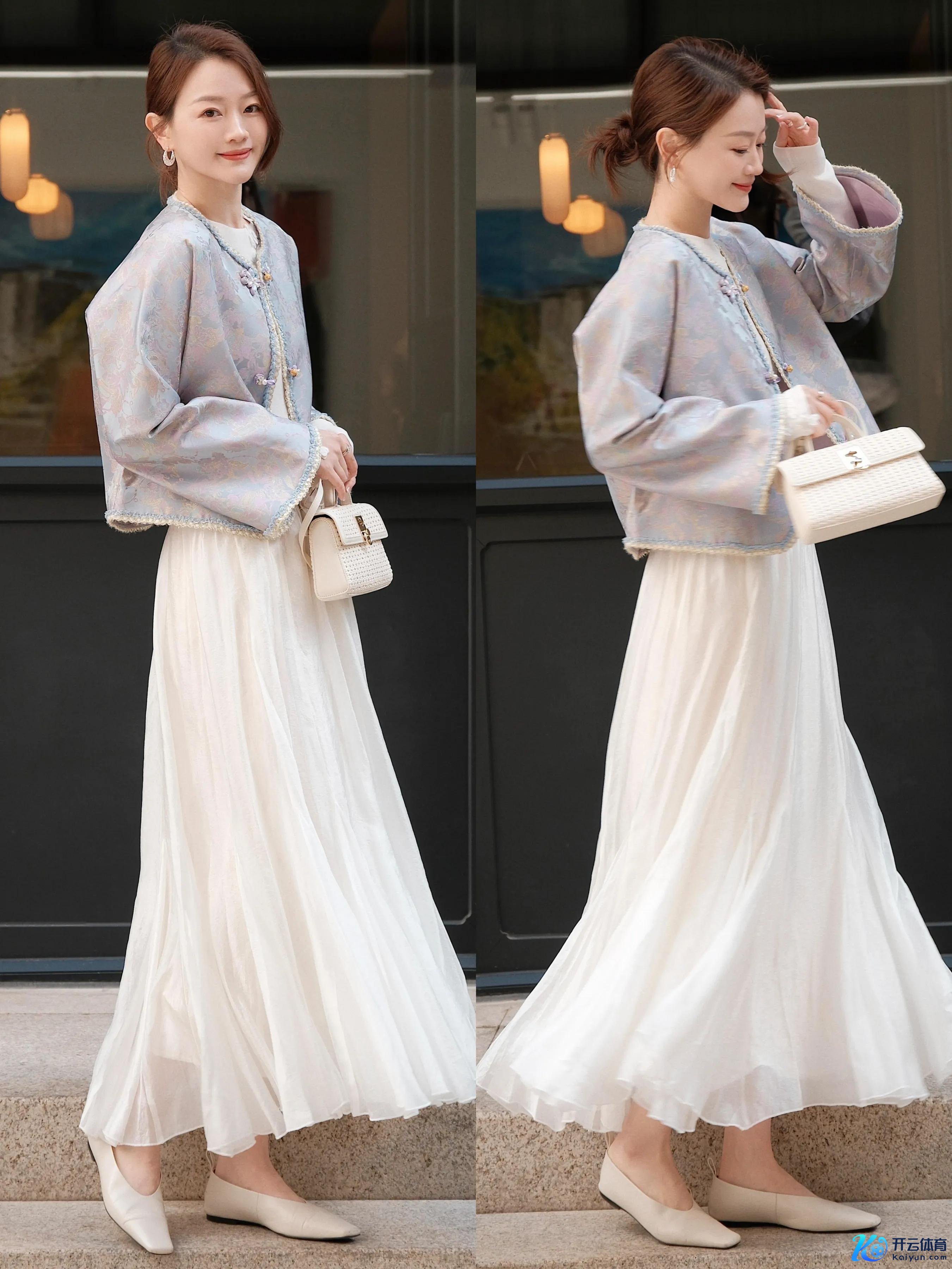 就像上头用新考中短外衣配上白色的薄纱伞裙,脚踩浅口低跟单鞋,既优雅又显赫,让你平静拿持春日氛围气味。