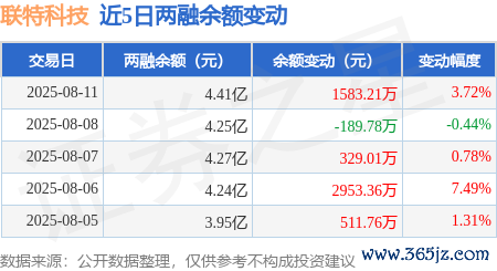 本站音信开yun体育网,8月11日,联特科技(301205)融资买入6912.87万元,融资偿还5338.07万元,融资净买入1574.81万元,融资余额4.4亿元。