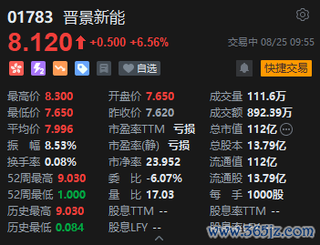 8月25日音讯,晋景新能(1783.HK)盘初拉升涨近9%,报8.3港元。戒指发文,晋景新能涨6.56%,报价8.12港元。