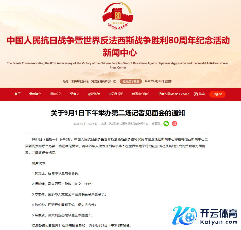 9月1日(星期一)下昼3时开云体育,中国东谈主民抗日接触暨寰宇反法西斯接触告捷80周年回想步履新闻中心将在梅地亚新闻中心二层新闻发布厅举办第二场记者碰头会,请华裔华东谈主代表先容华裔华东谈主辞寰宇各地举行的回想步履特殊抵御战的孝敬等方面情况,并回话记者发问。